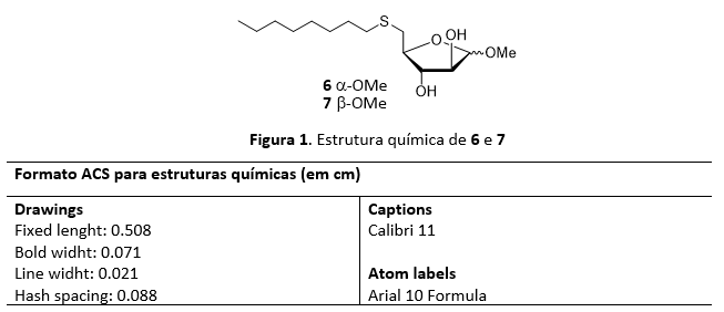 As estruturas químicas (Figuras e Esquemas) deverão ser feitas em ChemDraw e deverão ser inseridas de forma a permitir sua formatação e gravação pela editoria de formatação (inseridas no formato ChemDraw). O formato utilizado será o "ACS" - com legendas em Calibri 11 e negrito para a numeração.