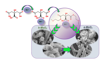 MoO3 with different structures was synthesized by the Pechini method. The hexagonal phase was obtained using an acidified solution, which also influenced the material morphology. The orthorhombic one was obtained after calcination of the hexagonal phase, or directly from the non-acidified polymeric resin.