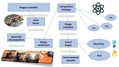 Landfills generate biogas through anaerobic decomposition of solid waste. This gas is composed mostly of methane (CH4) and carbon dioxide (CO2).