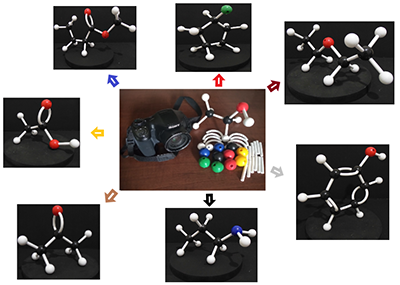 Producing videos with stop motion. The image shows pictures with representations of molecules in ball-stick models. With a camera, structural pieces and great care, several photos give life to what was previously stopped. Make your students producers.