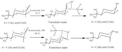 The reduction reaction between Ketone Trans (1A and 2A) and Cis (1E and 2E) 4-tert-butyl-2-X-ciclohexanone (X = F and Cl) with N-selectride provide, only, the alcohol axial and equatorial, respectively