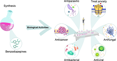 Benzodiazepine derivatives are heterocyclic nitrogen compounds that have diverse industrial, synthetic and medicinal applications. Numerous biological activities are related to this class: sedative, hypnotic, anxiolytic and anticonvulsant activities. In addition to bioactivity, the synthesis of this nucleus has attracted attention in many studies
