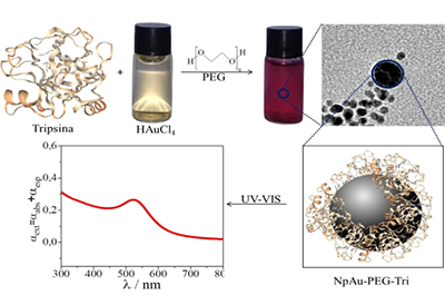 Process of obtaining gold nanoparticles stabilized by the trypsin enzyme, forming the AuNp-PEG-Try nanobioconjugate