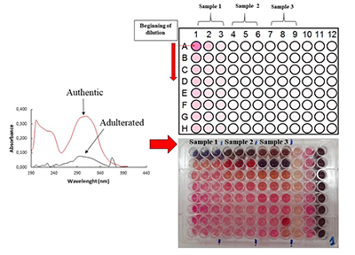 Left: UV-Vis spectra of one authentic sample (red) and other adulterated sample (black). Right: weak or no antimicrobial activity of samples 1 to 3 (false). Legend: 10: only culture medium, 11: culture medium with bacteria, 12: positive control (culture of bacteria + antibiotic).