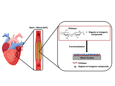 Schematic representation of the surface functionalization process of NiTi (Nitinol) alloy with chitosan-based composite coatings for biomedical applications.