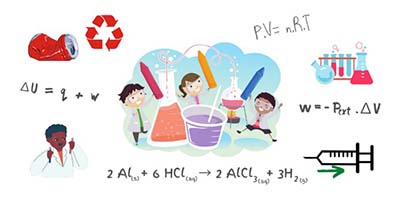 O gás hidrogênio, produzido na reação entre o alumínio e o ácido clorídrico, é coletado em uma seringa e o deslocamento do pistão (à pressão constante) é usado para o cálculo do trabalho.