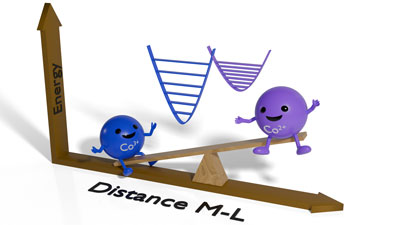 Electron transfer between a transition metal ion (M) and a redox-active ligand (L) with the potential energy curve versus bond length.