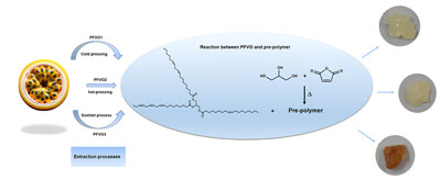 Biopolymers were synthesized and characterized using passion fruit vegetable oils obtained by different extraction processes.