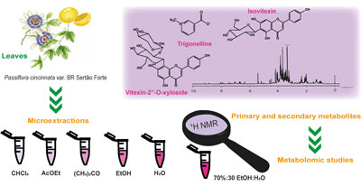 P. cincinnata leaves were submitted to extraction with a 70% ethanol-water mixture and the resulting extracts were analyzed via NMR spectroscopy, revealing signals of isovitexin, vitexin-2"-O-xyloside, and trigonelline, besides primary metabolites. The 1HNMR profile is suitable for metabolomic studies.